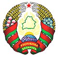 Государственный герб Республики Беларусьпредставляет собой размещённый в серебряном поле зелёный контур Республики Беларусь в золотых лучах солнца, восходящего над земным шаром. Сверху контура находится пятиконечная красная звезда. Герб обрамляет венок из золотых колосьев, переплетённых слева цветками клевера, справа — льна. Колосья трижды обвиты с каждой стороны красно-зелёной лентой (цвета белорусского флага), на которой снизу сделана надпись золотом: «Рэспубліка Беларусь».